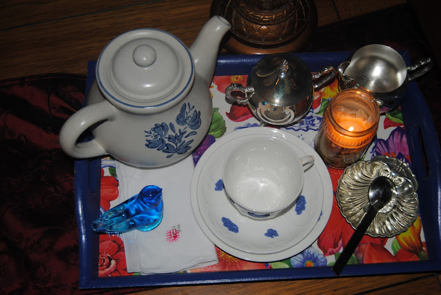 The Blue bird of Paradise was a gift from my daughter, Jennifer. The teapot is Yorktowne. The tea diffuser was my mother in laws.